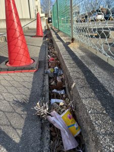 前回のクリーン活動から約2か月が経過し、周辺は比較的きれいな状態が保たれていたものの、側溝には再び落ち葉が溜まり、その中には空き缶や紙くず、たばこの吸い殻などのごみも多く見受けられました。