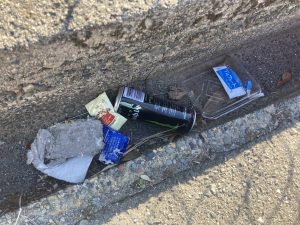 これらのごみは、ポイ捨てされたものが風にあおられて集まり、側溝に溜まってしまったものと考えられます。